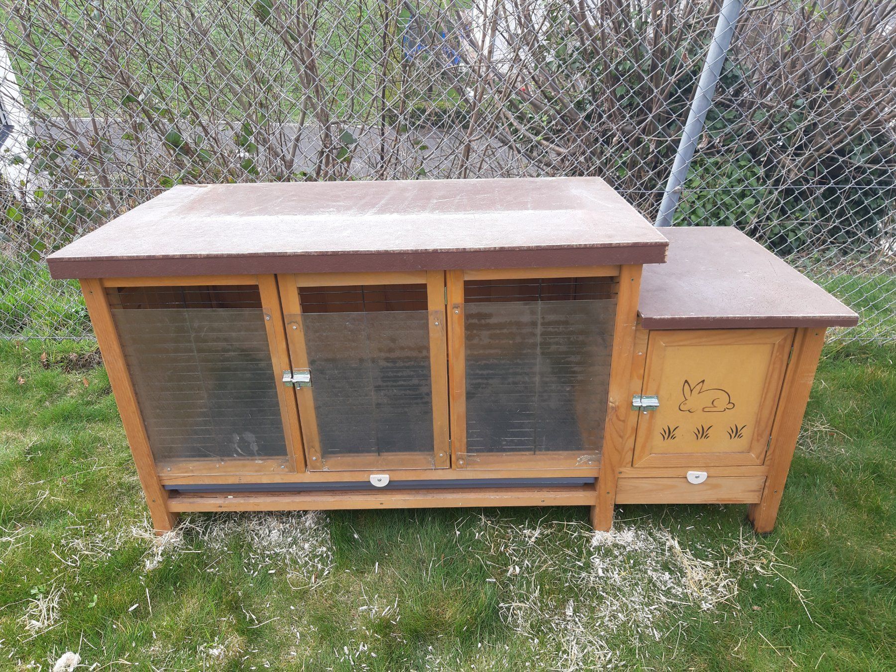 Hasenstall mit dach, verkleidung an der rückseite und an der linken seite.